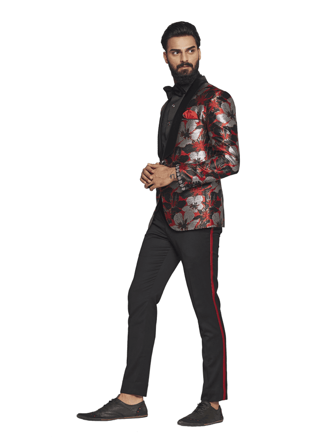 ?????A style essential in every man's wardrobe, our collection of Red and black jacquard tuxedo
