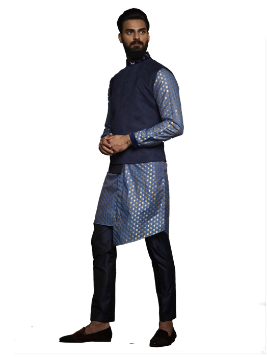 Originating from the royal Mughal lineage and still, an evergreen addition to a man's wardrobe is the very endearing Nehru jacket, usually called Jawahar jacket.The outfit is usually available without the sleeves and has buttons from the neck down to its entire length. Visit our store to see the different design in the same pattern.