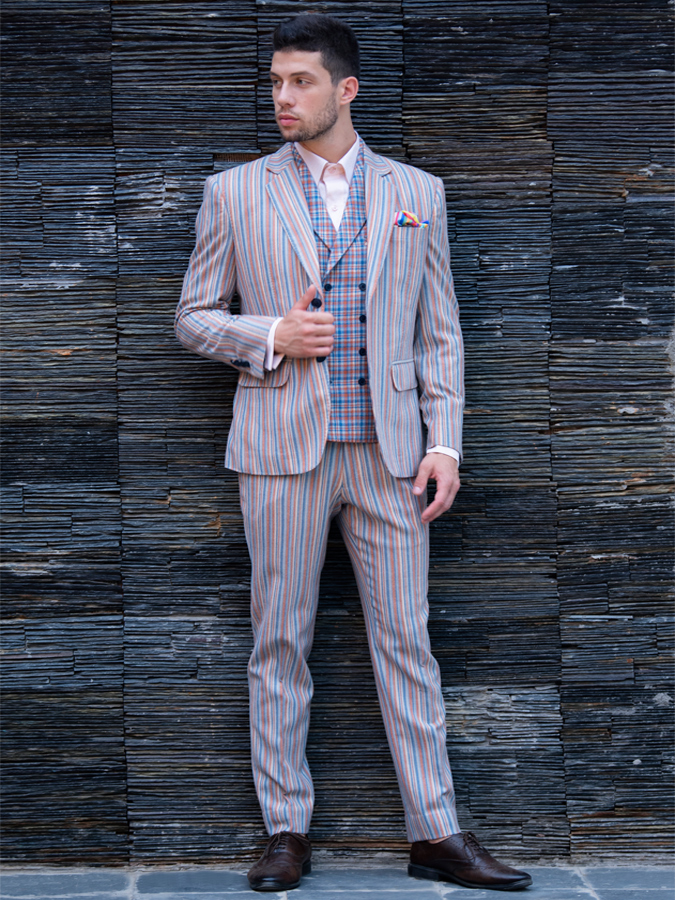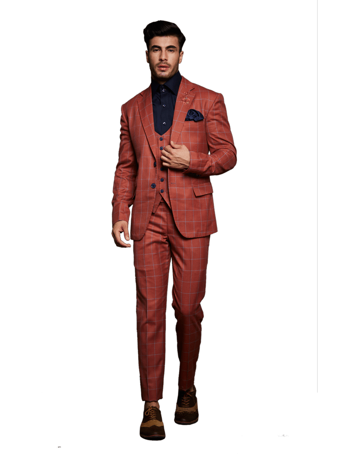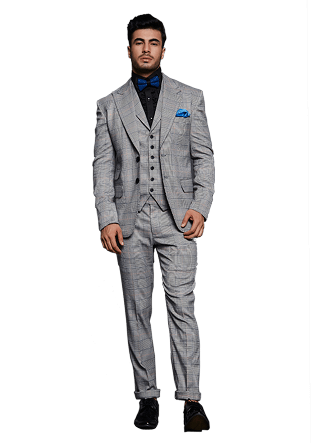 BLUE SELF JACQUARD SUIT BLUE ORANGE DOUBLE BREASTED STRIPE SUIT BLACK AND WHITE STRIPE SUIT SALT AND PEPPER SUIT PRINCE OF WALES GREY CHECK SUIT RUST AND BLUE CHECK SUIT BLUE WITH RED SELF SUIT Pink Suit KCMN Suit KCMN Suit KCMN Suit KCMN Suit KCMN Suit