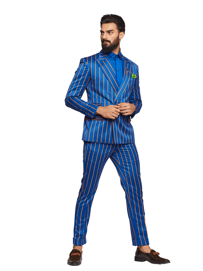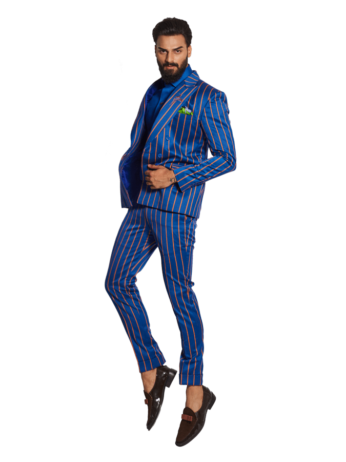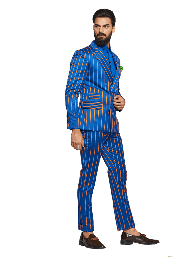 The most Common style of formal Wear in India Originated in Britain, Blue orange double breasted stripe suit are the most demanding style of men's Western wear.
